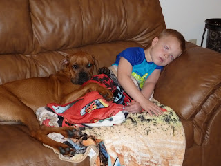 Is a snuggly puppy! Colin has been very sick with upper respiratory yuckiness. Fevers, green goop from his nose and eyes and coughing, poor little guy. He's been out of school all week and Cooper has been keeping him company while he rests on the couch.